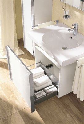 充分利用洗臉池下面的空間??梢栽谄渲性O(shè)計一個儲物柜,放入毛巾、牙刷、牙膏、及各式洗浴洗頭用品,也可以用來儲存衛(wèi)生紙和衛(wèi)生巾。安排這樣的儲物方式,能夠保證衛(wèi)浴空間必需的干濕分離。