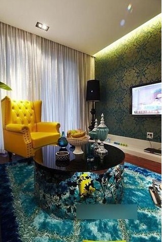 當(dāng)然,家里少不了落地?zé)?,還有整面彩色的墻紙。