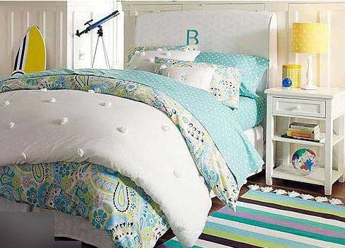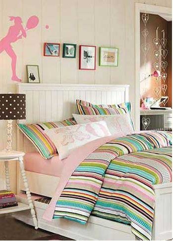 在彩虹般條紋地毯與白色墻面的襯托下,淡淡的床上用品彰顯出女孩性格溫婉的特征。