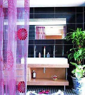 冷調(diào)的粉紫是調(diào)情的高手,手工刺繡的雛菊?qǐng)D案在紫紗上若隱若現(xiàn),給沉悶的衛(wèi)浴帶來遐想,沉醉在這明艷的色調(diào)中,享受全身心的放松吧!來點(diǎn)綠植,大片的綠葉豐富了黑色瓷磚的層次,給浴室?guī)砹藷o限的生機(jī)。