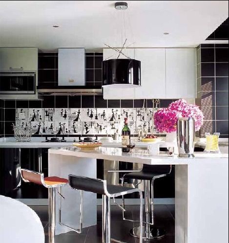 廚房間的吧臺(tái),時(shí)髦女郎男女居家中的最?lèi)?ài)。黑白插畫(huà)瓷磚,改變了黑白基調(diào)的沉默嚴(yán)肅,使房間變得輕松,浪漫。廚房這個(gè)沒(méi)有浪漫氣氛的地方也可以生出浪漫的感覺(jué)。
