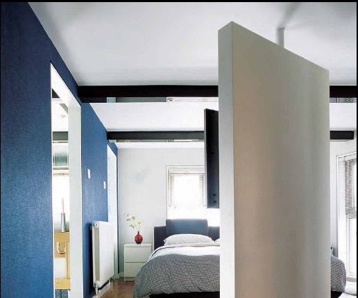 中戶(hù)型空間不大,所以在空間規(guī)劃上得特別細(xì)心??臻g小并不代表不精彩,一道轉(zhuǎn)墻的設(shè)計(jì)成為二層空間最大的亮點(diǎn)。分隔書(shū)房與臥室空間的是兩道半墻,其中一道可以自如旋轉(zhuǎn),關(guān)閉時(shí),兩個(gè)空間各自獨(dú)立,看電視的與看書(shū)的各不影響;而打開(kāi)時(shí),兩個(gè)空間相互貫通,隔離而不疏離。