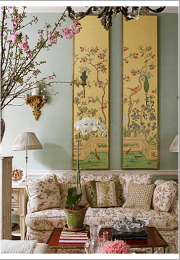 對(duì)稱的花鳥(niǎo)工筆畫(huà)卷,端麗雅致,在吊燈、壁燈、沙發(fā)等組合而成的標(biāo)準(zhǔn)西式客廳之中,依然能做到風(fēng)格上的渾然一體。