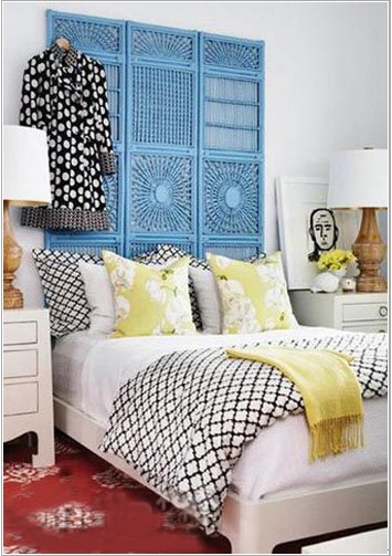 竹制的屏風(fēng)噴上了淺藍(lán)色,作為輕盈的床頭裝飾,它讓視線上延,強(qiáng)調(diào)了房間天花板的高度。