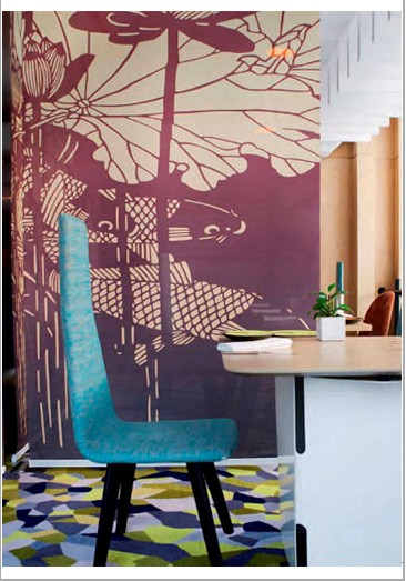 墻紙中式紋樣的放大,在視覺(jué)上極具沖擊力?!∨c幾何形圖案的地毯搭配,為享用大餐提供了現(xiàn)代又古樸的氛圍。