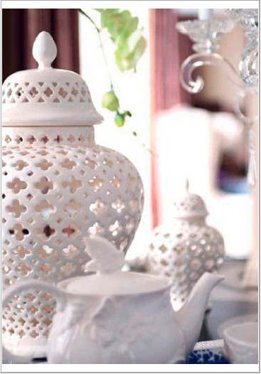 鏤空花工藝的香爐,擺放在客廳里。純白色給中國(guó)風(fēng)為中國(guó)風(fēng)平添了一份清新與雅致色彩。