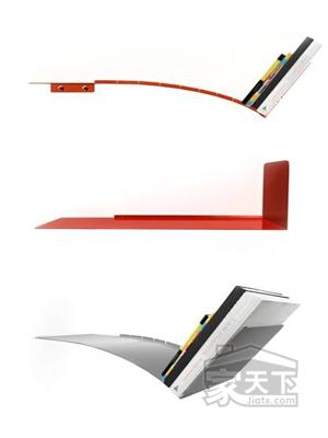 這款書架的設(shè)計(jì)非常的簡約,一塊薄薄的鐵板固定在墻上就變成了這樣一款書架。它的特點(diǎn)在于充分借助了鐵板的韌性,只要像圖中那樣以此挨放在書架上就會在重力的作用下將其壓彎,這樣一來另一側(cè)也無須增加書檔卻仍然可以將書放的穩(wěn)穩(wěn)當(dāng)當(dāng)。