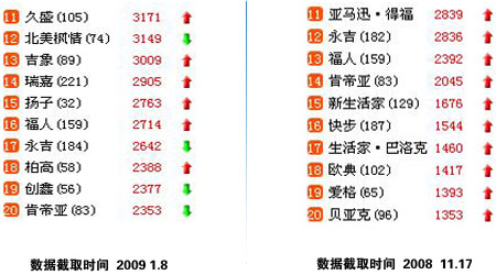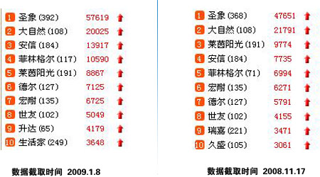 相對與第一集團(tuán)的穩(wěn)定相比,第二集團(tuán)則競爭激烈,各品牌之間大有拼個你死我活之勢。通過兩組不同數(shù)據(jù)的對比,能夠從去年11月份“活”到今年1月的僅有永吉、福人及肯帝亞三家,除了從第一集團(tuán)跌下來的瑞嘉和久盛外,其他的品牌被殘忍地擠出了第二集團(tuán)。