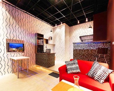 方案一:波普藝術(shù)風(fēng)格以亮白及暗紅兩色壁紙將空間一分為二,暗紅色規(guī)則波紋線條壁紙從沙發(fā)區(qū)一路延伸至后方吧臺(tái)區(qū)塊,亮白色不規(guī)則波紋線條壁紙則占滿了大片室內(nèi)空間;在休閑區(qū)選用安定感色系波紋,在工作區(qū)選用活潑明亮風(fēng)格壁紙,具象的沖突感在設(shè)計(jì)師巧手下呈現(xiàn)微妙平衡,再搭以藤蔓編飾圖紋深色壁紙包覆的吧臺(tái)及工作臺(tái),擺上大紅及亮白的造型沙發(fā),營(yíng)造lounge bar氛圍,成為寓工作于娛樂(lè)的工作空間。