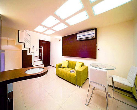 方案二:現(xiàn)代機(jī)能 實(shí)用至上 沙發(fā)背后的鐵刀木簡(jiǎn)約背墻,既包覆住冷氣管線,在近門(mén)處一側(cè)并裝有感應(yīng)式照明,用溫暖光線歡迎返家的居住者,另外三側(cè)亦設(shè)置間接光源,讓空間光影表情更生動(dòng)。本案設(shè)定為投資用途,天花板的幾何方塊設(shè)計(jì),遮掩丑陋的日光燈管,維修方便,且分段式開(kāi)關(guān)發(fā)揮節(jié)源功能,明亮的光源,做為住屋或是小型工作室出租皆無(wú)問(wèn)題。