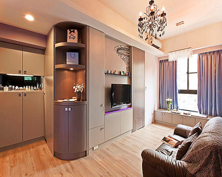 方案三:現(xiàn)代簡(jiǎn)約風(fēng)格 家具的設(shè)定特別選擇較低水平線的小型家具,客廳墻面不設(shè)置電視柜,選擇小型視聽(tīng)柜、茶幾,讓挑高的空間感覺(jué)更加放大。以架高地板的方式,設(shè)置小階梯,將臥鋪與客廳明確分別開(kāi)來(lái),并利用兩者地板間的落差,規(guī)劃抽屜式的收納柜,增加小空間里的收納功能。