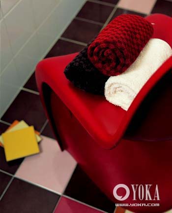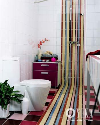 彩色地磚是突出的設(shè)計(jì),粉色、紅色與咖啡色自然過(guò)渡,穿插裝飾,整個(gè)色彩環(huán)境讓人感受到一種溫暖和舒爽,并搭配同色系的浴室配件,呈現(xiàn)出獨(dú)具魅力的女性氣質(zhì)。