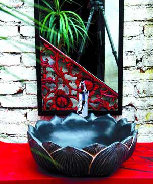 荷花容易讓人想到意境悠遠(yuǎn)的環(huán)境,荷花造型的手盆更容易讓人產(chǎn)生無(wú)盡遐想。黑色給手盆增添了厚重,光滑的內(nèi)部讓人感覺(jué)到石藝的溫潤(rùn),這樣的手盆搭配紅色古典浴室柜給人幽香的感覺(jué)。