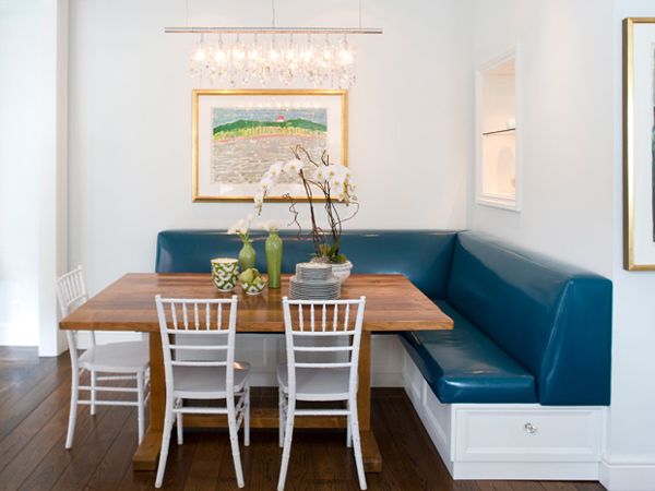 深湖顏色的沙發(fā),原木色的餐桌,一切以自然為主