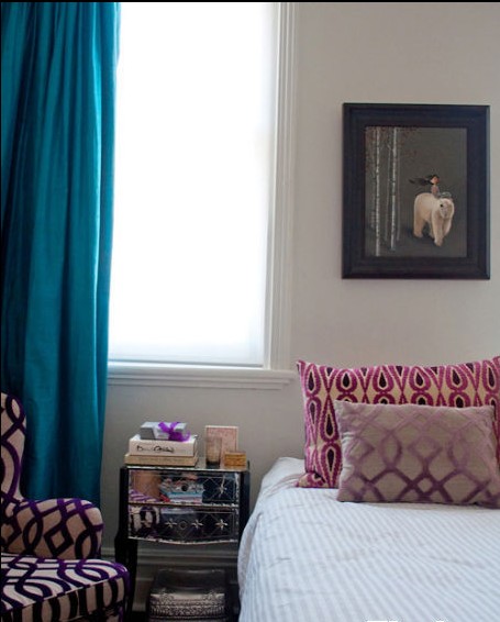 臥室是另一個重點(diǎn),進(jìn)入臥室,臥室里的裝飾沒有如同客廳的粉色,粉色在某種程度上是浪漫,還是另一個貶義——幼稚的代名詞。那么臥室的裝飾重點(diǎn)就在紫色、紅色曲線的綜合運(yùn)用了。