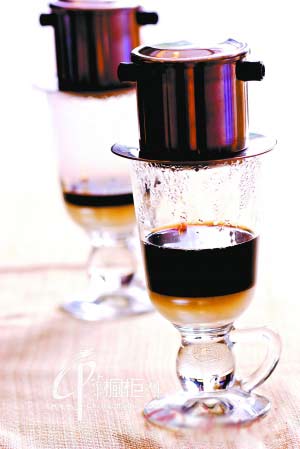 越南的咖啡風(fēng)情很大程度在于其沖泡過程,它不是用咖啡壺煮,而是一種特殊的滴濾咖啡杯,下面用樣式古老的印花玻璃杯接著,就像沙漏在計時一樣,一滴一滴都用來消磨曼妙時光。做的時候下面的玻璃杯杯口架上滴漏杯,在滴漏里面放咖啡粉,壓上一片有洞孔的金屬片,再用熱水沖泡,讓咖啡滴滴答答的滴到杯子內(nèi)。講究一點的做熱咖啡時把杯子架在一個加滿開水的大碗里保溫,因為滴完一杯咖啡可能要用十分鐘,熱咖啡會涼掉。有人喜歡在杯子底下加一層很甜很甜的煉乳,等咖啡都滴到杯子里,再把咖啡和白煉乳混合起來喝。如果是黑咖啡,一般不給你吸管,如果是有煉乳的就會給你吸管。只有那些耐得住性子的人,才會等待到一杯咖啡滴完了,再慢慢吞吞地喝下去,領(lǐng)略到慢活的美妙。