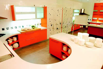 U型櫥柜的打造方式是國外比較流行的櫥柜模式,以它為基礎(chǔ)打造出的廚房對于活動區(qū)域的要求很高而且要求有很大的面積,一般情況下,U形櫥柜應(yīng)該遵循三個原理。U形櫥柜實例打造首先實現(xiàn)了分區(qū)處理,另外將廚房各個不同功能都依據(jù)不同的特點安排在這個U形櫥柜之內(nèi)。中間是酒臺兼餐桌,使之具備了社交的功能。