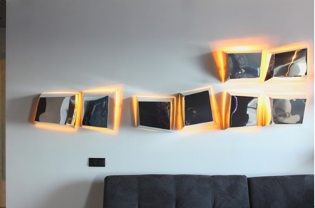 運用鋁板包住燈泡,形成了獨特的沙發(fā)背景。晚上在黑夜的侵襲下,整個冷色調(diào)的空間下多出了一絲絲的暖意,別有一番風(fēng)味。