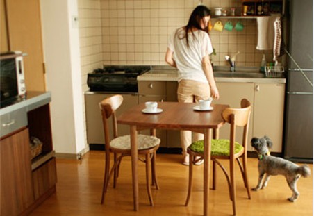 小餐廳與廚房是在一起的,水池與操作臺(tái)連著煤氣,加上冰箱的擺放位置正好是這個(gè)空間里的整體長(zhǎng)度,一點(diǎn)空間都沒(méi)浪費(fèi)出來(lái)。廚房用具里的瓶瓶灌灌都有序的擺放在掛勾上。操作臺(tái)的下方是定制的廚柜,空間分明,可以根據(jù)要求,擺放不同的物品。餐桌的是精挑細(xì)選的哦,90公分長(zhǎng)不到,兩個(gè)精致小巧的木質(zhì)餐椅。