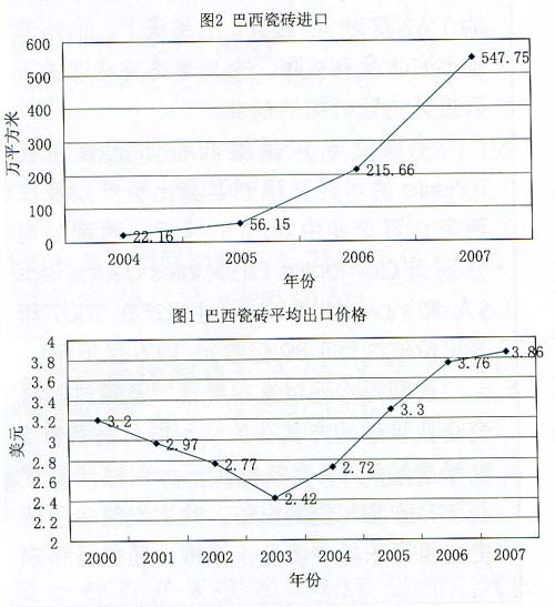 巴西瓷磚出口在2000年至2004年之間呈增長趨勢,從5670萬平方米增長到了1.26億平方米.之后出現(xiàn)下降趨勢,2007年降到了1.02億平方米。前期得到增長是因為“巴西干法”產(chǎn)品的質(zhì)量與濕法產(chǎn)品非常接近,加上合適的利率,于是生產(chǎn)商紛紛尋找機會擴大市場。然而,隨著利率的變化以及國內(nèi)市場的增長,生產(chǎn)商們改變了策略,大大減少了出口。2C104年之后,雖然出口量下降.但是出口額反而增加.這主要是由于出口產(chǎn)品中價格較高的產(chǎn)品所占比重增加.平均出口價格上漲(見圖1)。
