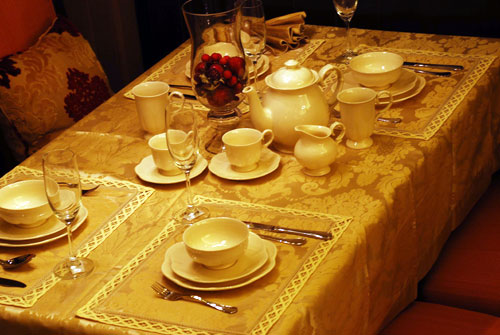餐桌上,餐布選用暗金色帶緹花的設(shè)計(jì)展現(xiàn)低調(diào)的奢華感,配合素雅的奶白色餐具別有一番特色,再擺上一個(gè)玻璃的器具做點(diǎn)綴,內(nèi)置紅色的裝飾品也跟其粉紅色的椅子相呼應(yīng),更顯優(yōu)雅溫馨的感覺。