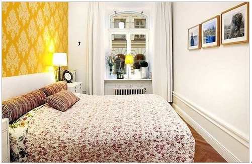亮黃色的墻面,簡約的燈飾,以及床頭設(shè)計,整個房間色調(diào)反射出暖暖的溫馨氣息。裝飾性的相框給房間加入了活潑的元素。
