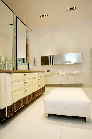 在浴室里擺放一件沙發(fā)隨時(shí)享受溫暖和舒適已不再是夢(mèng)想,象牙白混油高光的意德法家圖蘭朵浴室柜系列即擁有這一配置:皮質(zhì)扣釘?shù)拈L條沙發(fā),矮矮地放置在浴室鏡與浴缸之間,可于浴后小坐品一杯紅酒、也可于優(yōu)雅轉(zhuǎn)身間稍事休息并放置物品,造型輕巧,可移動(dòng)到任何角落。