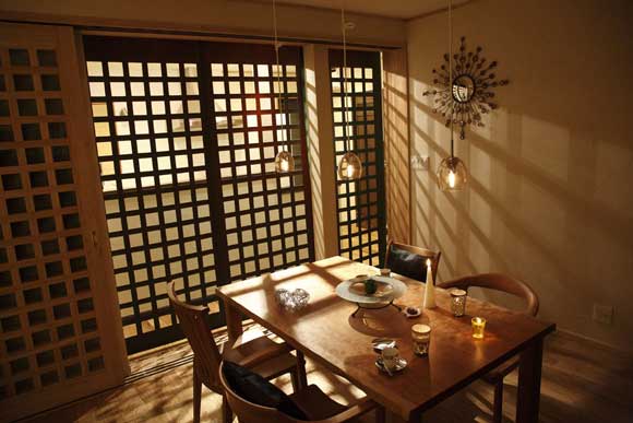 飯廳里的桌椅都是木頭做的,上圖為自色光線情況下,有著另外一翻情調(diào)。燈光穿過(guò)格子屏風(fēng)投影在墻上,繪出交錯(cuò)的線條,光與影的藝術(shù)讓這個(gè)飯廳顯得與別不同。格子屏風(fēng)是裝飾上的一大美點(diǎn)所在。