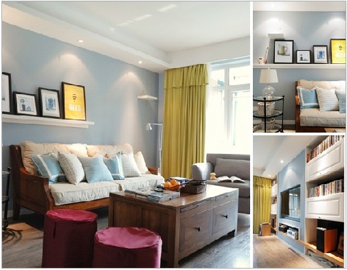 概要: 房間用色干凈、明快,藍色、白色以及原木本色、碎花點綴,有著田園的閑適,地中海的蔚藍。整個室內房間采光很好,空間顯得大而通透??蛷d沙發(fā)區(qū)緊鄰著落地的大窗戶,巧妙地將戶外的美景引入到居室內。白色的單人沙發(fā),帶有暗花的淡藍色靠枕,以及純色窗簾,把它們組搭在一起,色調非常清爽。