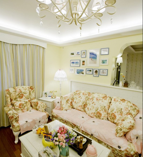 田園風格的客廳,墻面上是淡雅的淡黃色墻面墻漆,溫馨感由面而來。沙發(fā)的碎花與淡淡的粉色墊布映稱著墻面,空間的層次感突顯。