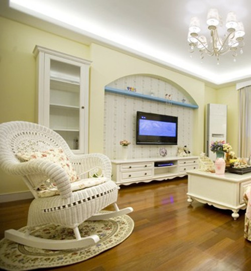 我想每一個女人都想在家里放這樣一張搖搖椅,看書,小眠都是很好的選擇。電視柜的背景墻面以內(nèi)凹的設計配以墻貼上白底藍花條紋壁紙,間隔的線條令空間更開擴。