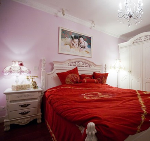 粉紅的墻面,喜慶的床品,新婚夫妻的新婚房。