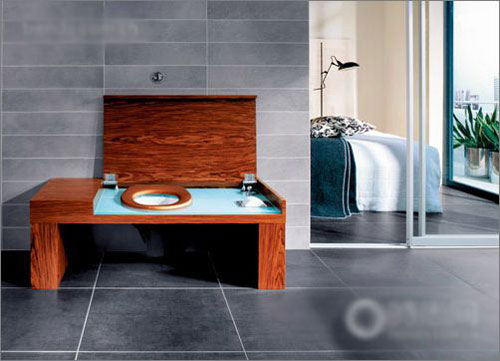 在高雅的木質(zhì)家具中隱藏著陶瓷坐便器 ,只有翻開木質(zhì)長凳面板后才能看見該陶瓷坐廁