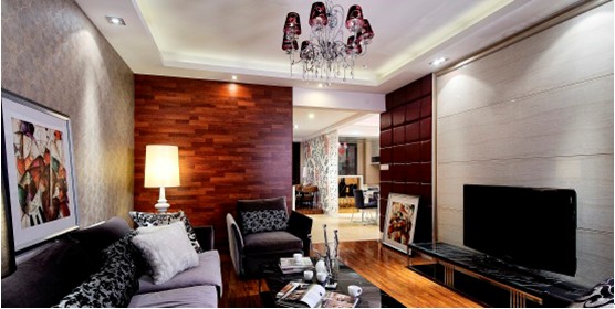 電視背景墻的紫色皮革軟包、沙發(fā)后面的暗紅色木飾面墻涌動(dòng)一種內(nèi)心的**;黑白相間的靠枕、淡紫色的布衣沙發(fā)、銀色墻紙、抽象的裝飾畫均在白色的天頂下扮演各自的精彩;