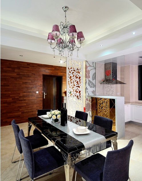 后現(xiàn)代風(fēng)格是時(shí)下年輕人的首先,它與時(shí)尚最接近。本案例的房子原有一入戶陽(yáng)臺(tái),設(shè)計(jì)師通過(guò)改造將入戶陽(yáng)臺(tái)融入室內(nèi)空間讓室內(nèi)空間更完善方正。入口處通過(guò)一玲瓏紋屏風(fēng)來(lái)區(qū)分兩大區(qū)域,前區(qū)門廳區(qū),后區(qū)就餐區(qū),使空間即分割又統(tǒng)一。電視背景墻的紫色皮革軟包和次衛(wèi)門口背景墻的紫色皮革軟包,燈罩的暗紫色線條和沙發(fā)的薰衣草紫色,還有入口休閑區(qū)的馬賽克夏花的拼圖紋理這些元素?zé)o不在營(yíng)造著浪漫的生活空間,正適合這對(duì)將要走進(jìn)新婚殿堂的新婚夫婦。設(shè)計(jì)師在選擇家具上也下了不少的心思,餐桌選用黑白根大理石臺(tái)面配搭玲瓏鏤空花圖紋的不銹鋼腳,客廳的茶幾,電視柜子,白色的裝飾落地?zé)艉托蓍e區(qū)白色系列;