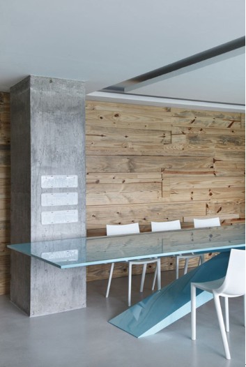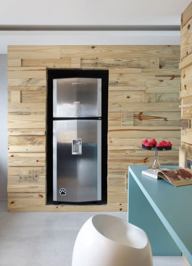公寓內(nèi)的裝修采用聚合水泥,墻壁則選用松樹木拼接而成,原汁原味的設(shè)計自然又環(huán)保。而桌與椅的色彩延續(xù)了客廳的色調(diào),湖藍點綴白色,清新淡雅!