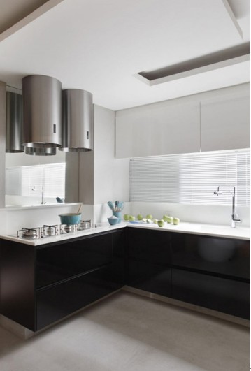 廚房采用了光亮的黑油漆,人造大理石臺面干凈宜打理。現(xiàn)代廚房并非只為烹調(diào)而生,它更強化其生活及融合整個居家氛圍。