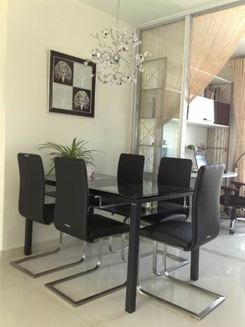 走進(jìn)餐廳黑色的餐桌椅,看起來沉穩(wěn)、嚴(yán)肅,但是卻不失高貴,白色的線簾還有綠色的植物,好清新的餐廳,看后有心動(dòng)的感覺不。