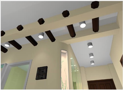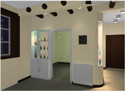 這頂上造型還挺有的個性的哦,設(shè)計師用中式六邊木梁來掩飾原來過梁的突出部分,再利用小圓柱體造型的燈飾,這樣的結(jié)合很完美。原來的缺陷在這樣的設(shè)計下別有一番風(fēng)味!