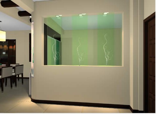 一進(jìn)入戶就看見了廚房的淡綠色玻璃藝術(shù)隔墻!