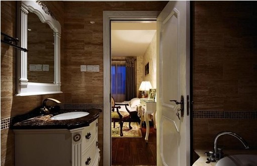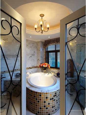 主浴室推門就是一個大大的浴缸展現(xiàn)在你面前,還原了衛(wèi)生間的本態(tài),腰線與浴缸的馬賽克相呼應,再配上大理石,使的整個空間張力十足。