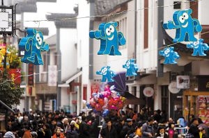 游客在安亭老街上觀看海寶彩燈。記者 張海峰 攝