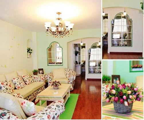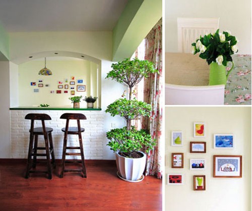 客廳處處點(diǎn)綴著淡淡的綠色,清新淡雅。油亮的實(shí)木地板,清新的沙發(fā)靠枕,鮮活的小花,使得整個(gè)客廳充滿新鮮與靚麗。