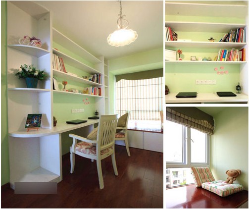 考慮的對眼睛的好處,書房背景墻面選用了大量的淺綠色,搭配上深色的實(shí)木地板,給人一種厚重感。在這樣光線自然的書房里學(xué)習(xí),愜意舒適。