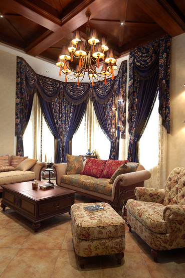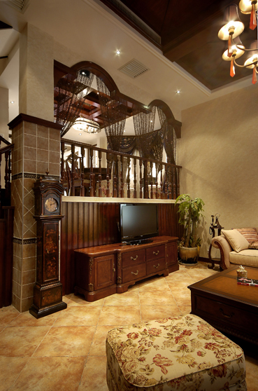 如前所述,此空間定性為美式風(fēng)格.那么用材便有了范圍—-磚,紙,木,布藝等.便捷,隨意,休閑是美國(guó)人居最為強(qiáng)調(diào)的,于是,此空間也不無(wú)例外.如客廳和餐廳極為突出,整個(gè)環(huán)境決不刻意賣弄性的作無(wú)畏裝點(diǎn).當(dāng)中強(qiáng)調(diào)交通流線的合理,起居休閑時(shí)的舒適和諧,功能布置的實(shí)用于方便.為了提煉出整個(gè)空間的層次與文化積淀,用才上,特別是對(duì)于磚的取材,考慮的都是仿舊仿古系列,好像在訴說(shuō)這是一個(gè)家族一代一代輝煌的生活傳承.縱閱整個(gè)別墅,窗簾布藝在此當(dāng)中起到了不可忽視的作用,從最基礎(chǔ)的為每個(gè)特性空間調(diào)節(jié)人居生活認(rèn)為合適光度之外,他們自身獨(dú)特的花紋,掛式以及色感為這個(gè)以美式定義的空間增添出浪漫,個(gè)性,舒適大氣的視覺(jué)美感.在家具陳列選擇上,強(qiáng)調(diào)整體風(fēng)格的統(tǒng)一—大氣,隨意,輕松.每個(gè)個(gè)體家具表現(xiàn)的氣質(zhì)同樣非常獨(dú)到,同時(shí)也非常配合的表現(xiàn)出懷舊與人文傳承的個(gè)性.