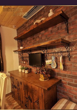 餐邊柜隔板和柜子一起定的,鐵藝的支架是婷婷畫了圖定做的,買冰箱送的小電視正好掛在墻上,將來可以一邊看烹飪節(jié)目,一邊學做菜嘍。