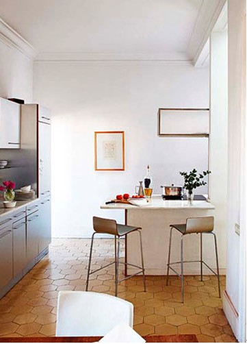 空間獨(dú)特的幾何圖形地面設(shè)計(jì),土黃色的地板很好的凸顯出白色的墻面,也起到拉伸空間的作用。小料理臺(tái)延伸的設(shè)計(jì)構(gòu)思也很不錯(cuò),這樣不僅能將餐廳與廚房合二為一,更使得廚房溫馨許多。