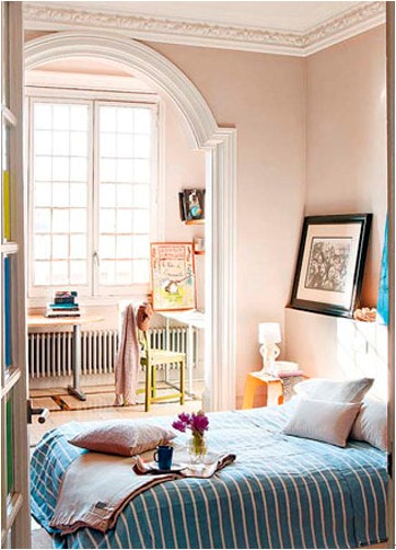 藍(lán)色的條紋床品占據(jù)了大部分的視線范圍,讓臥室看起來(lái)清新而舒適。五彩繽紛的幾何混搭而成的格子拱門,詼諧又具有變化的色調(diào)提升空間的趣味性,也消除了藍(lán)白色調(diào)造成的冷清感。