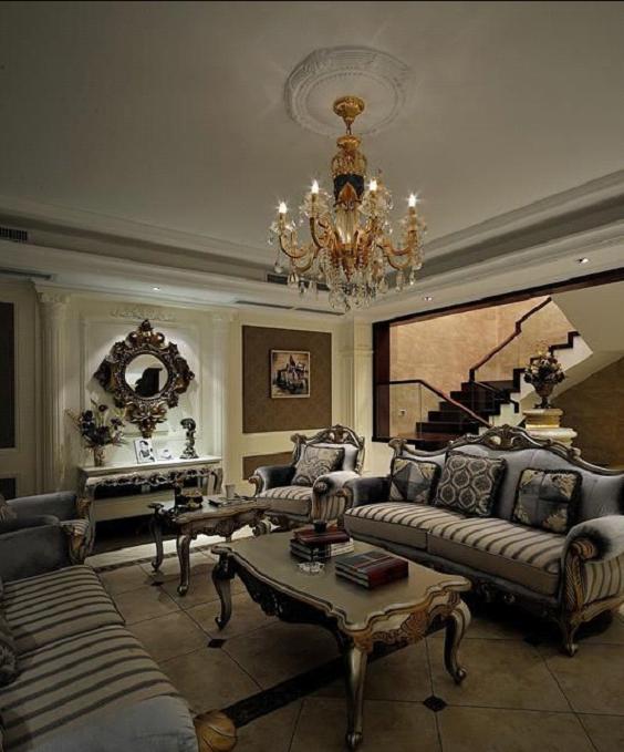 會(huì)客廳還原了他原本的功能,并沒有放電視機(jī),而是用裝飾壁爐代替了傳統(tǒng)的壁爐,在美觀上和實(shí)用性上都考慮的很到位。整套沙發(fā)的顏色用偏冷的色調(diào)來烘托整個(gè)空間的暖色調(diào),是的空間極具顯張力。這個(gè)方案在細(xì)節(jié)之處抓到了極致,不管是壁爐的造型、裝飾柱還是頂部吊燈的裝飾,精湛的技術(shù)活不得不讓人折服。