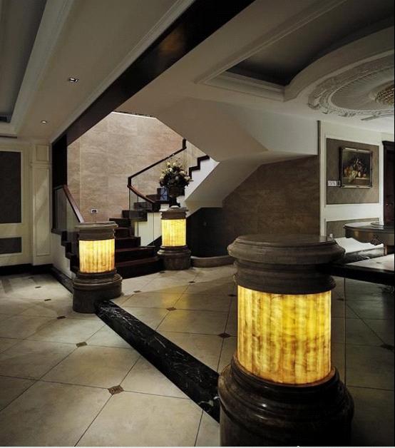 空間采光的局限性,所以過道這塊采光不是很理想,再加上復(fù)雜的吊頂,是的很壓抑,并且很沉悶,燈柱的運(yùn)用很是巧妙,其柱的樣式與整體相呼應(yīng)的同時(shí),錯(cuò)落有致的擺放,給空間多了些錯(cuò)層和靈動(dòng)感,很好的蓋其壓力沉悶之氣。